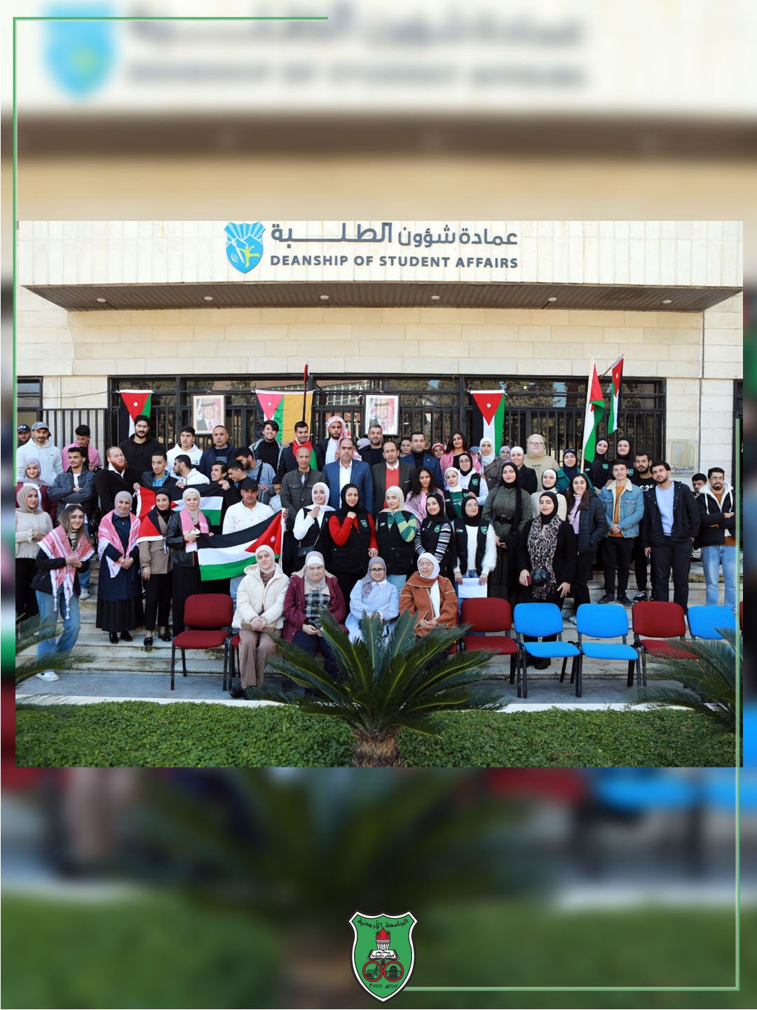 كما أكَّدت عمادة شؤون الطلبة أنَّ شباب الجامعة الأردنيّة كانوا وسيبقون "فرسان التغيير" وسياج الوطن الحصين، مُستلهمين من جلالة الملك قيم العزم والإصرار، وماضين قدمًا للحفاظ على صورة الأردن نموذجًا في الريادة والصمود.
