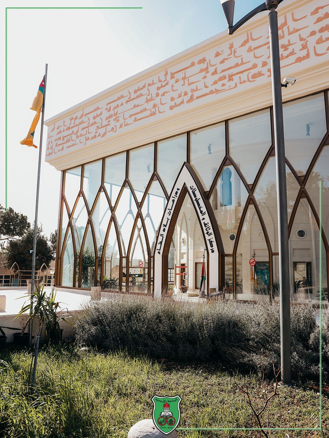عند مدخله الرّئيسيّ تستقبلك جماليّة الأقواس الزّجاجيّة، والآياتُ القرآنيّة المُدوَّنة بالخطّ الكوفيّ تُزيّن جدرانَه الخارجيّة، أمّا المَشربيّات الخشبيّة *التي* تتميّز بها واجهته الخلفيّة، والنّوافذُ المُقنطَرة ذات الأقواس المُدبّبة، ما هي إلّا دلالاتٌ على تفرّد وخصوصيّة المبنى دونًا عن كلّ مباني الجامعة، شكلًا ومضمونًا.