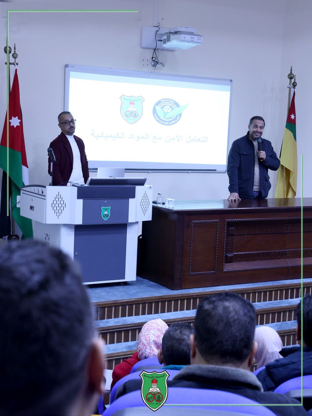 وقدّم المحاضرةَ الدكتور محمد الطراونة، حيث استعرض أبرز الأسس العلميّة للتعامل الآمن مع المواد الكيماويّة، وآليات التخزين السّليم، ومتطلبات الوقاية الشخصيّة، إضافةً إلى إجراءات الاستجابة الفاعلة للحوادث والطوارئ، بما يسهم في الحدّ من المخاطر المحتملة داخل المختبرات ومواقع العمل المختلفة.