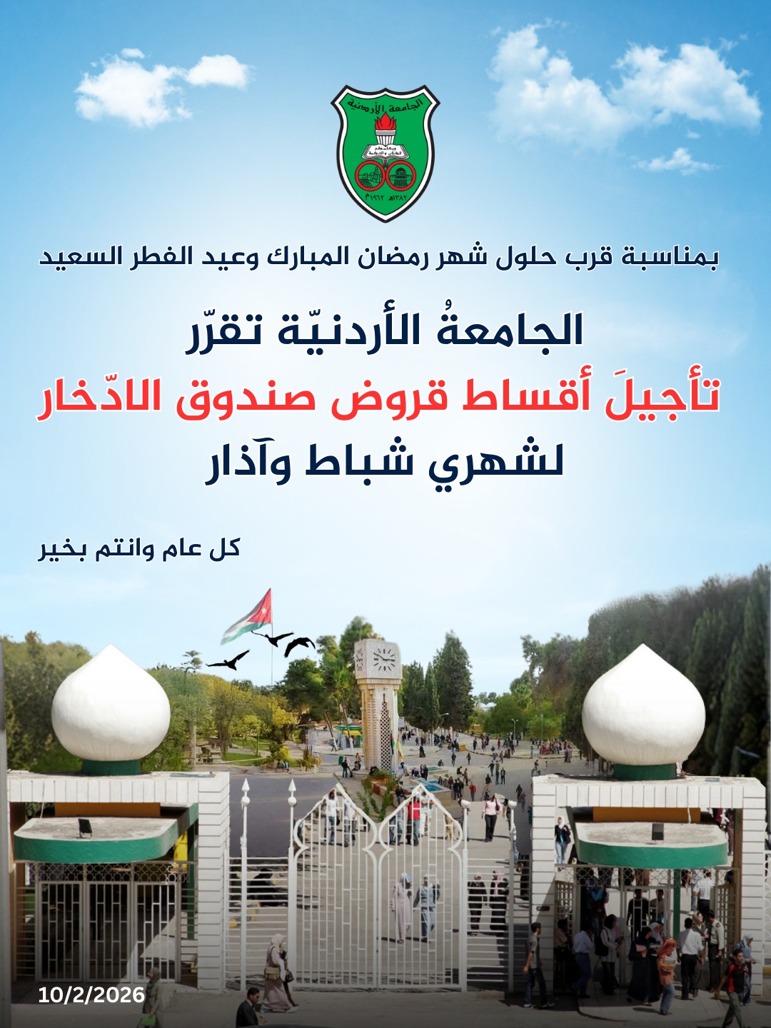 قرّر رئيسُ الجامعة الأردنيّة الدكتور نذير عبيدات تأجيلَ أقساط جميع قروض صندوق الادّخار عن شهري شباط وآذار لهذا لعام 2026، بمناسبةِ حلول شهر رمضان المبارك وعيد الفطر السعيد.