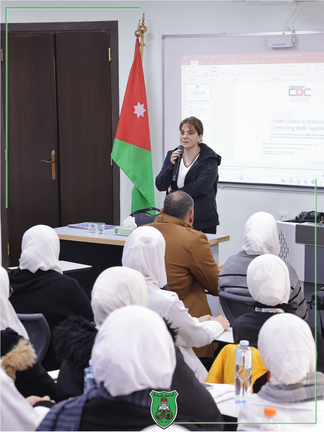 Held in line with the University’s directives and in close coordination with Jordan CDC, the lectures highlighted the essential role of future health-care professionals in responding to antimicrobial resistance. Speakers underscored the importance of the One Health approach, which links human, animal and environmental health, as a comprehensive framework for curbing resistant infections and safeguarding communities.